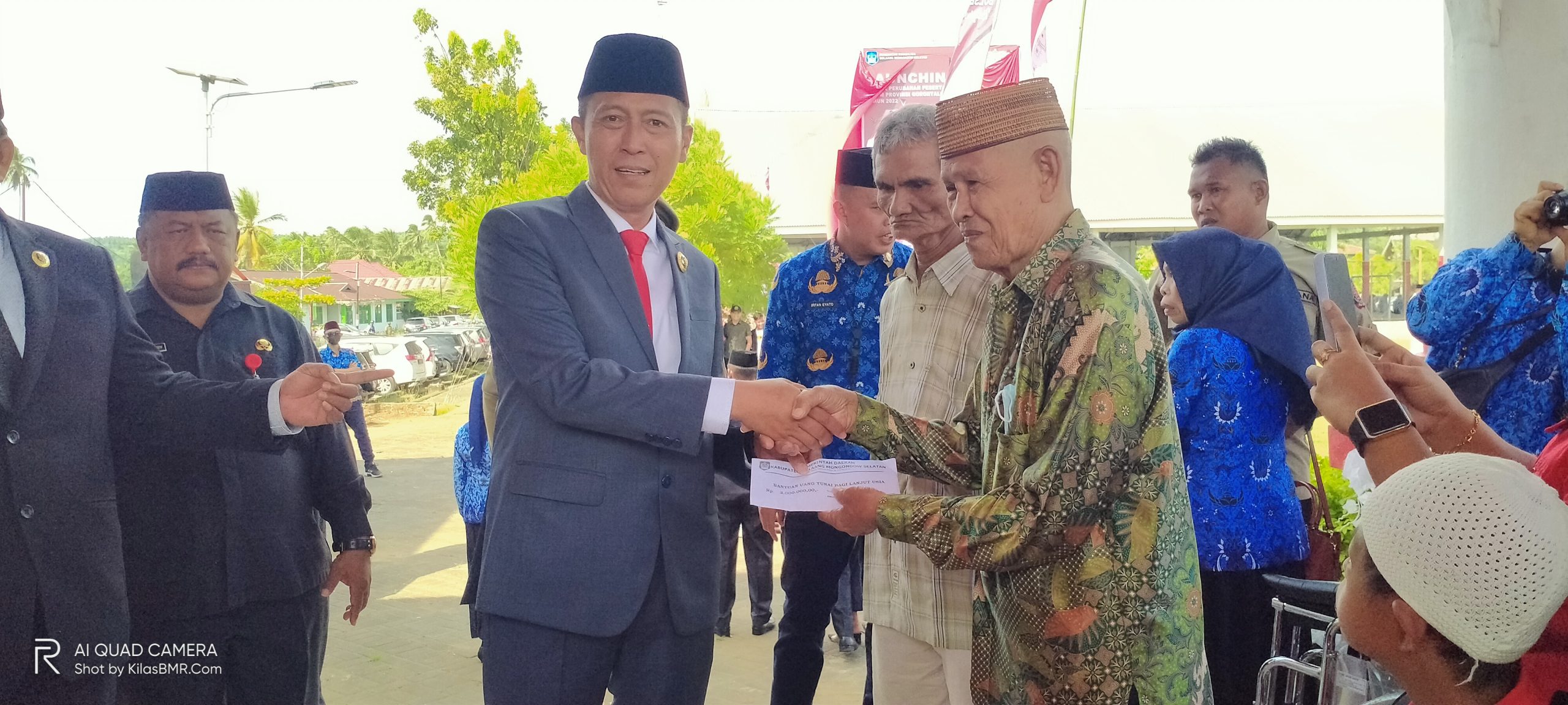 Selesai upacara, Bupati dan Wabup Bolsel menyerahkan bingkisan serta bantuan kepada para veteran sekaligus pelepasan para atlit Porprov Kabupaten Bolsel.