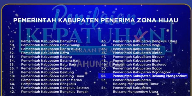 Namun untuk kategori kabupaten se-provinsi Sulawesi Utara (Sulut), kabupaten Bolmong menduduki peringkat pertama (1).