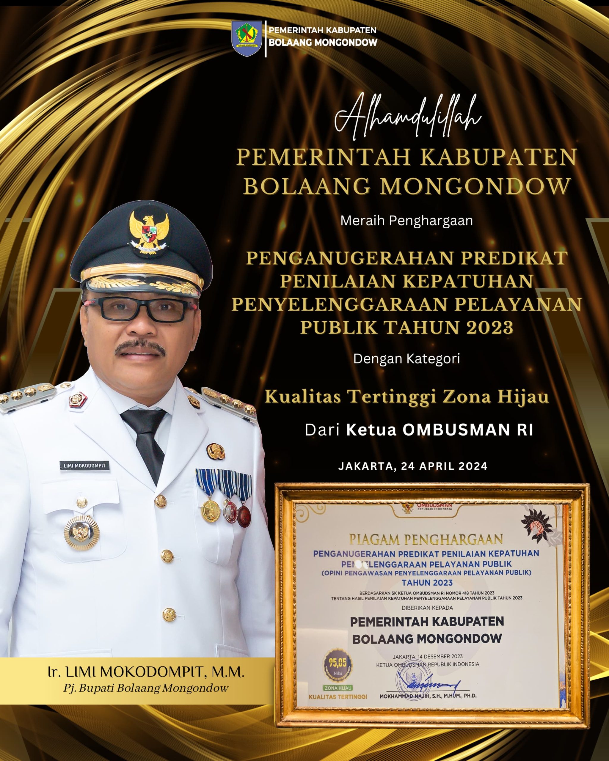 Pemerintah Kabupaten (Pemkab) Bolaang Mongondow (Bolmong), meraih opini kualitas tertinggi (kategori A) dalam penilaian kepatuhan penyelenggaraan pelayanan publik tahun 2023 yang dilakukan oleh Ombudsman RI.