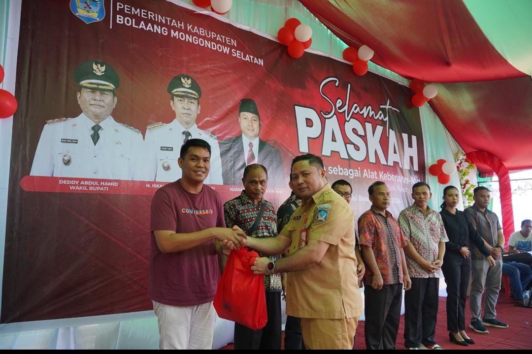 Sekda Bolsel Marzanzius Arvan Ohy yang mewakili Bupati H. Iskandar Kamaru, Spt. Msi, saat memberikan sambutan, mengatakan atas nama pribadi, keluarga dan pemerintah daerah mengucapkan selamat merayakan paskah bagi umat kristiani yang ada di kabupaten Bolsel.