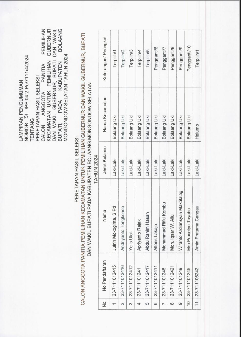 Pengumuman tersebut berdasarkan berita acara rapat pleno KPU Kabupaten Bolsel nomor: 31/PP.04.1-Pu/7111/4/2024 tentang rapat pleno penetapan hasil seleksi PPK untuk pemilu tahun 2024.
