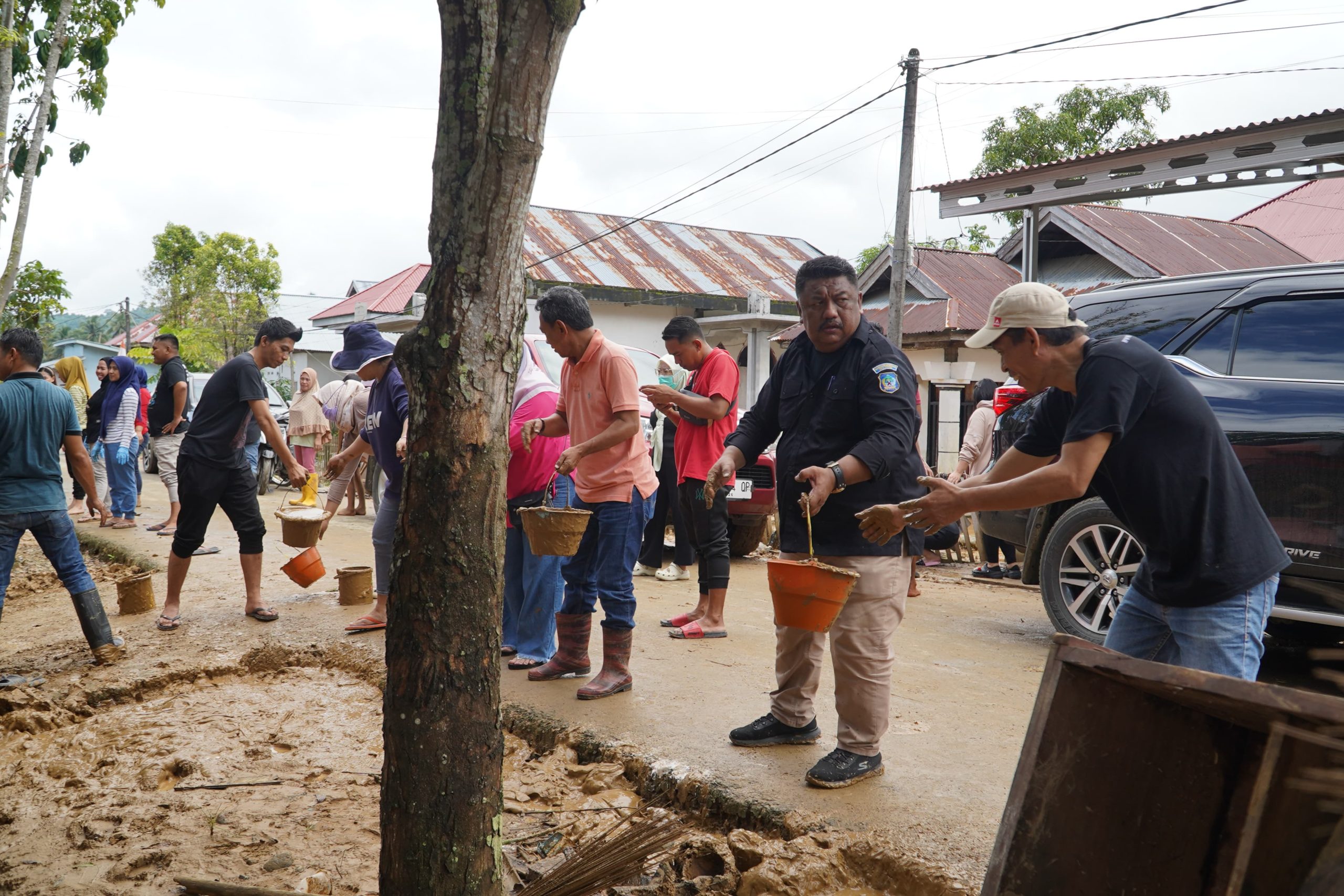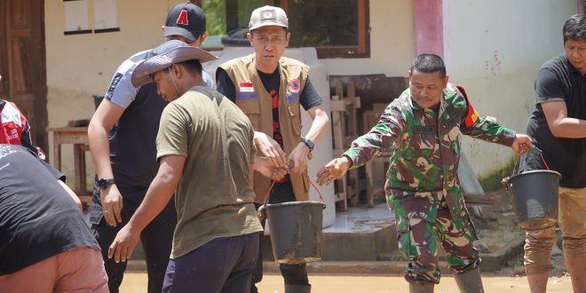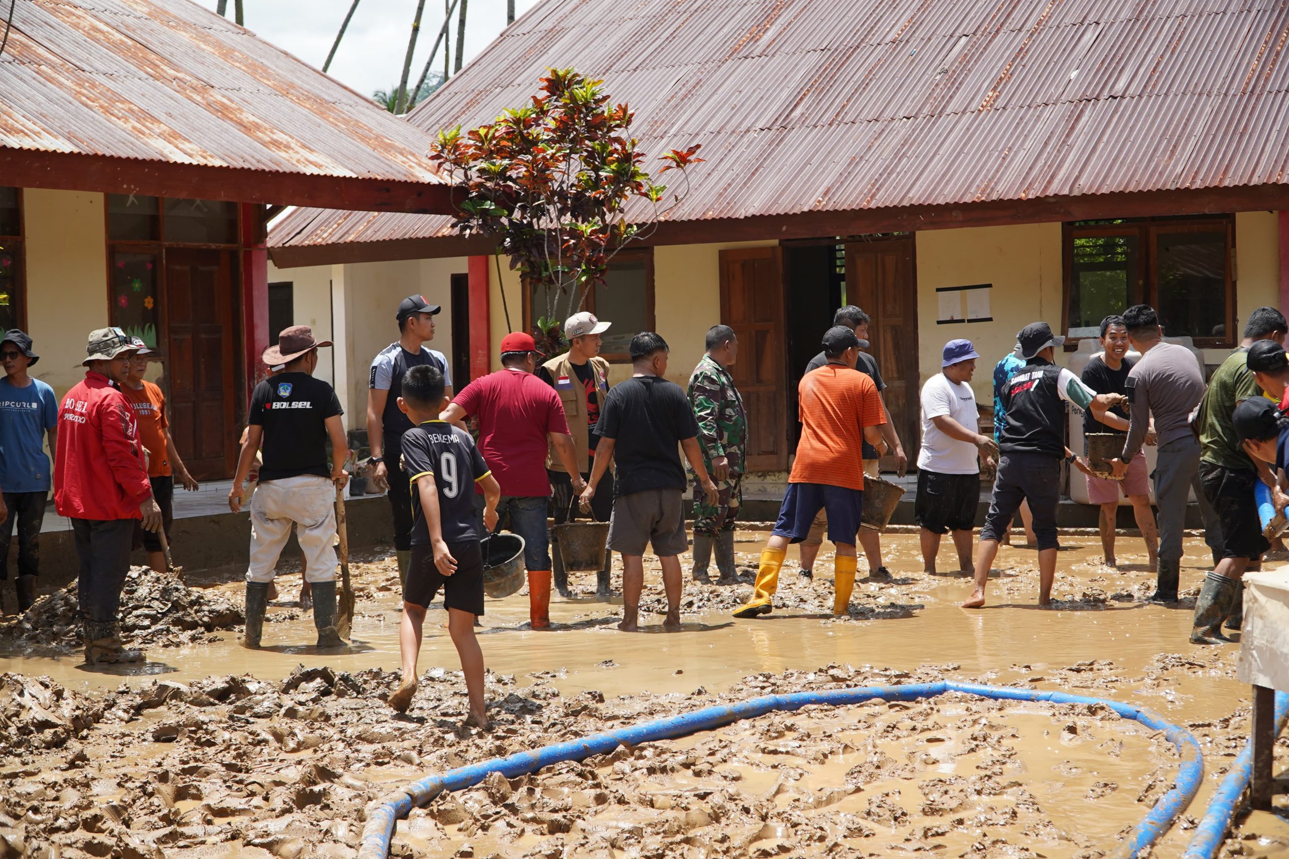 Terpantau, jajaran perangkat daerah dan personil TNI/Polri bergabung dengan warga setempat bahu membahu bekerja sama membersikan lumpur sisa banjir baik itu di desa Torosik, Adow, Tobayagan induk, Tobayagan Selatan, Dumagin B dan Dumagin A.
