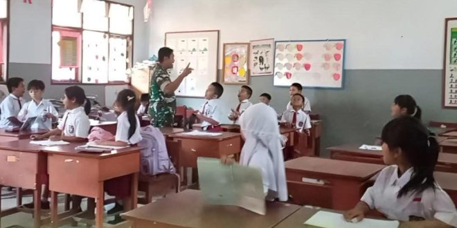 Di hadapan para siswa sekolah dasar, Kopda Irwan memperkenalkan kembali nilai-nilai fundamental bangsa, mulai dari menghafal butir-butir Pancasila hingga memahami makna kebangsaan secara sederhana namun mendalam.
